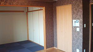 このお部屋は一見すると和室かな?と思われますが洋室です。床は深い紺色系統のタイルカーペット、そしてクロスにも重厚感