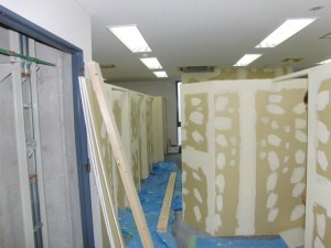 ![]() | マッサージ店ということでいくつかの個室が必要になります。まずは個室の間仕切りづくり。設計した通りの位置、高さ、幅で壁となる部分の骨組みを作っていきます。 |